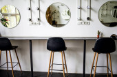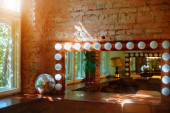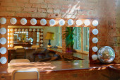Zdjęcie "Nowoczesny pokój do makijażu wnętrz. Stół z lustrem przy ciemnej ścianie. Garderoba z lustrem i stołem do makijażu. Miejsce fryzjerskie dla fryzjera i charakteryzatora - fotele i lustro oświetlone. " może być wykorzystywane do celów osobistych i komercyjnych zgodnie z warunkami zakupionej licencji Royalty-free. Obraz jest dostępny do pobrania w jakości wysokiej rozdzielczości do 5760x3840.