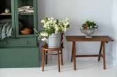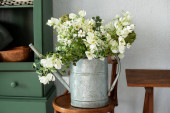 Zdjęcie "Piękny bukiet kwiatów w podlewaniu puszki na drewnianym krześle przez szafkę. Koncepcja ogrodnictwa. Vintage narzędzie ogrodowe. Stylowa kuchnia z kwiatami w wazonie. Przytulny wystrój domu. Kuchnia z meblami" może być wykorzystywane do celów osobistych i komercyjnych zgodnie z warunkami zakupionej licencji Royalty-free. Obraz jest dostępny do pobrania w jakości wysokiej rozdzielczości do 5760x3840.