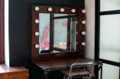 Metalowe żyrandole w stylu retro na tle drewnianych półek z wystrojem. Ciemny pokój z trzema nowoczesnymi lampami nad stołem. Trzy nowoczesne czarne lampy sufitowe wiszą w pokoju, zbliżenie. Wnętrze pokoju Loft.