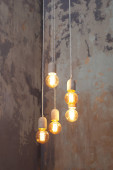 Zdjęcie "Metalowe żyrandole w stylu retro na tle drewnianych półek z wystrojem. Ciemny pokój z trzema nowoczesnymi lampami nad stołem. Trzy nowoczesne czarne lampy sufitowe wiszą w pokoju, zbliżenie. Wnętrze pokoju Loft. " może być wykorzystywane do celów osobistych i komercyjnych zgodnie z warunkami zakupionej licencji Royalty-free. Obraz jest dostępny do pobrania w jakości wysokiej rozdzielczości do 5760x3840.