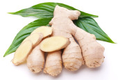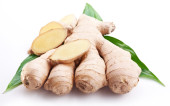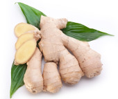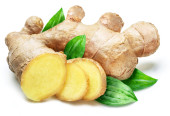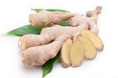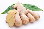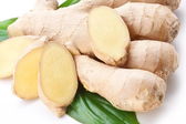 Świeży imbir z liśćmi wyizolowanymi na białym tle.