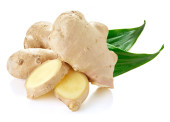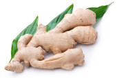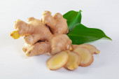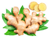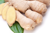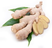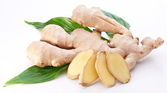 Świeży imbir z liśćmi wyizolowanymi na białym tle.
