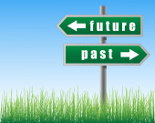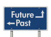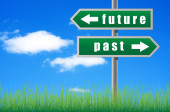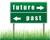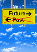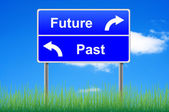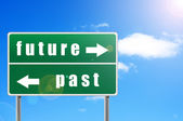 Znak drogowy przyszłości przeszłości na tle nieba.