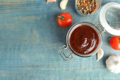 Stylowa brązowa gliniana miska z ukraińskim barszczem serwowana na białym drewnianym stole, płaska leżanka. Miejsce na tekst