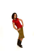 ładna kobieta w krótkie brązowe sukienka i buty, siedząc na podłodze pokazano jej ładne nogi, uśmiechając się do kamery, na białym.