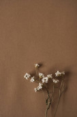 Pusta kartka papieru z makietą miejsca do kopiowania, muszla, piękne białe kwiaty przed neutralną brązową ścianą. Minimalna marka estetyczna biznesu, blog, tło szablonu mediów społecznościowych