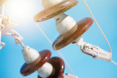 Nur-Sultan, Kazakhstan - 05.28.2015 : High-voltage power lines with insulators, stabilizers and transformers.