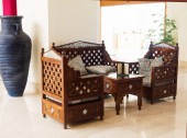 jeden stół i krzesła z drewnianych desek z zielonymi roślinami domowymi stoi na ulicy w kawiarni miejskiej i posąg buddha i kubek lub filiżanka kawy, Indie.