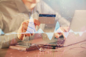 Podwójna ekspozycja rąk człowieka trzymających kartę kredytową i rysunek wykresu Forex 'a. Handel akcjami i cyfrowy fintech w koncepcji e-commerce.