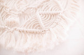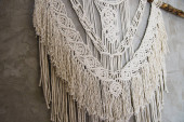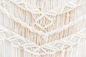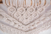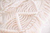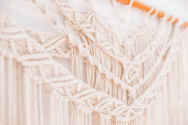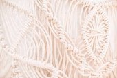 ręcznie robiony wzór makramy fragment panelu ściennego w stylu boho z beżowej bawełnianej nici koloru naturalnego przy użyciu techniki dekoracji wnętrz domowych i ślubnych