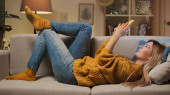 Sieci społecznościowe. Młoda biała brunetka przesyła wiadomości na smartfonie w domu, siedząc wygodnie na jasnej, pastelowej sofie. Dziewczyna rozmawiająca w domu. Koncepcja technologii i ludzi. Fotok zapasowy