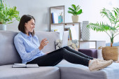 Zdjęcie "Biała kobieta z brązowymi włosami, korzystająca z laptopa, siedząc na kanapie w domu. Zmotywowana tysiącletnia studentka ucząca się zdalnie z domu. Kobieta freelancer pracuje online na komputerze" może być wykorzystywane do celów osobistych i komercyjnych zgodnie z warunkami zakupionej licencji Royalty-free. Obraz jest dostępny do pobrania w jakości wysokiej rozdzielczości do 5760x3840.