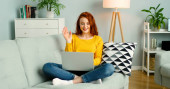 Biała kobieta z brązowymi włosami, korzystająca z laptopa, siedząc na kanapie w domu. Zmotywowana tysiącletnia studentka ucząca się zdalnie z domu. Kobieta freelancer pracuje online na komputerze