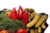 Marynowane warzywa-ogórek, pomidor, pieprz, na białym, izolowanym tle.