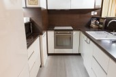 Szary i biały apartament szczegóły wnętrza z małą otwartą kuchnią