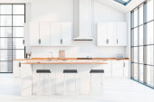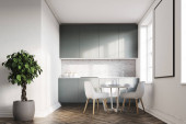 Zdjęcie "Jasne przytulne wnętrze pokoju kuchnia ze stołem jadalnym i czterema krzesłami, szafka, piekarnik, dąb drewniana podłoga parkietowa. Nowoczesny skandynawski minimalistyczny design. 3d renderowanie" może być wykorzystywane do celów osobistych i komercyjnych zgodnie z warunkami zakupionej licencji Royalty-free. Obraz jest dostępny do pobrania w jakości wysokiej rozdzielczości do 5760x3840.
