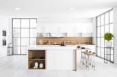 Jasne przytulne wnętrze pokoju kuchnia ze stołem jadalnym i czterema krzesłami, szafka, piekarnik, dąb drewniana podłoga parkietowa. Nowoczesny skandynawski minimalistyczny design. 3d renderowanie