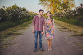 ogród para zakochanych w kwitnących jabłoni, uśmiechający się.