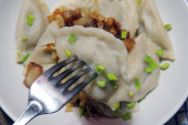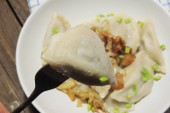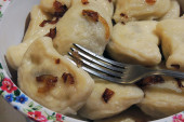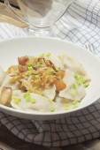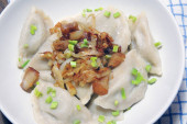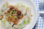 Smażone pierogi nadziewane kapustą i mięsem posypane skwarkami z bekonu i siekaną pietruszką na białym talerzu na drewnianym rustykalnym stole.