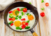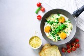 Jajka smażone ze szpinakiem i pomidorami wiśniowymi z kawą na śniadanie. Szare tło. Widok z góry