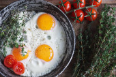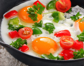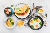 Zdjęcie "Jajka smażone ze szpinakiem i pomidorami wiśniowymi z kawą na śniadanie. Szare tło. Widok z góry" może być wykorzystywane do celów osobistych i komercyjnych zgodnie z warunkami zakupionej licencji Royalty-free. Obraz jest dostępny do pobrania w jakości wysokiej rozdzielczości do 5760x3840.