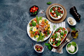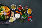 Pyszne grillowane warzywa z sosami i przekąskami serwowane na jasnoszarym tle. Menu z grilla. Widok z góry, przestrzeń kopiowania