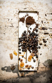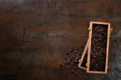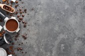 Widok na filiżankę espresso z ziarenkiem kawy rozrzuconym na drewnianej desce i garnkiem pod twardym porannym słońcem