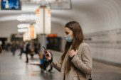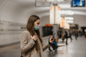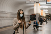 Kobieta w masce medycznej, aby uniknąć rozprzestrzeniania się koronawirusu, stoi i używa smartfona w nowoczesnym wagonie metra. Dziewczyna w masce chirurgicznej przewija wiadomości przez komórkę w pociągu..