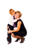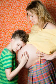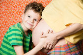 mały chłopiec delikatnie ogarnąć ciąży matki, strzelać studio