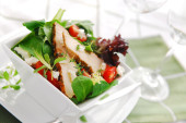 Sałatka Cezar w szklanej misce i białego wina