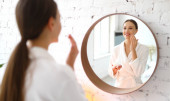 Szczęśliwa młoda kobieta w szlafroku stosująca krem kosmetyczny na twarz i ciesząca się miękkością skóry podczas sesji piękności spa w domu