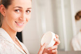 Szczęśliwa młoda kobieta w szlafroku stosująca krem kosmetyczny na twarz i ciesząca się miękkością skóry podczas sesji piękności spa w domu