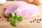 Filet z piersi indyka zamrożony na drewnianej desce w kuchni