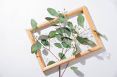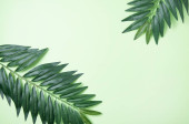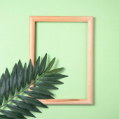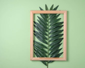 Dwa liście palmy i drewniana rama na żółtym tle. Widok z góry i miejsce na tekst