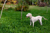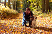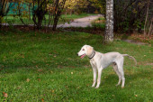 dziewczyna w czarnej sukni i saliki biały szczeniak w lesie