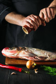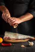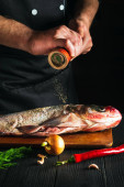 Kucharz przygotowuje świeże ryby karpia wielkogłowego posypywania pieprzem. Przygotowuję jedzenie dla ryb. Środowisko pracy w restauracji lub kawiarni kuchnia