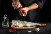 Zdjęcie "Kucharz przygotowuje świeże ryby karpia wielkogłowego posypywania pieprzem. Przygotowuję jedzenie dla ryb. Środowisko pracy w restauracji lub kawiarni kuchnia" może być wykorzystywane do celów osobistych i komercyjnych zgodnie z warunkami zakupionej licencji Royalty-free. Obraz jest dostępny do pobrania w jakości wysokiej rozdzielczości do 5760x3840.