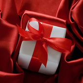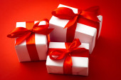 małe białe pudełka z czerwoną wstążką na czerwonym tle. używać go na specjalne okazje ilustracje.