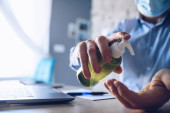 Kobieta z maską bezpiecznie kupuje artykuły spożywcze pośród pandemii koronawirusa w supermarkecie.