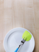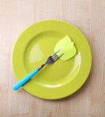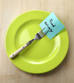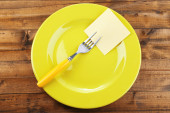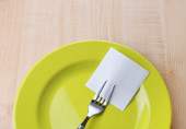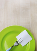 pusta notatka papier dołączone do stołu, na talerzu, drewniane tła kolor