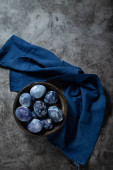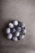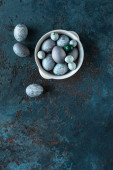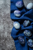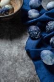 organiczne jaja wielkanocne z bliska, ręcznie malowane naturalnymi jagodami, leżą w glinianym kubku na kamiennym stole. Koncepcja wielkanocna.