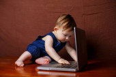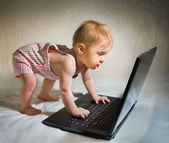 dziewczynka w białej sukni z laptopa na czarnym tle