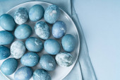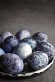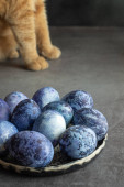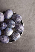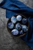 marmurowe pisanki na ciemnym tle, ręcznie malowane naturalnymi jagodami, leżą w glinianym kubku na kamiennym stole. Koncepcja przygotowania Wielkanocy.