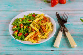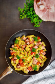 Kolorowe rottini makaronowe, pomidory wiśniowe i szynka na patelni. Widok z góry.