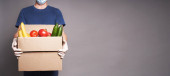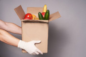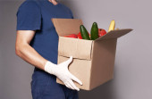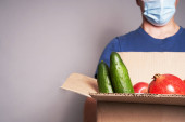 Kurier w masce z pudełkiem zakupów, bezpieczna dostawa żywności.