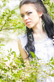 portret piękna, młoda dziewczyna z brunetką w retro sukienka na charakter. kobieta zebrał jej kosz na piknik