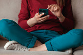 Kobieta korzystająca z telefonu komórkowego, trzymająca się za ręce na kanapie