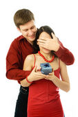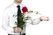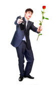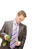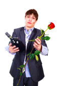 przystojny młody mężczyzna z czerwoną różę i butelkę brandy