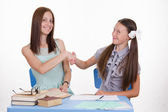 Schoolmarm gratulacje uczeń, drżenie dłoni z pomyślne wykonanie zadania