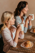 szczęśliwy dziewczyny gospodarstwa filiżanki herbaty podczas siedzenia na kanapie w salonie